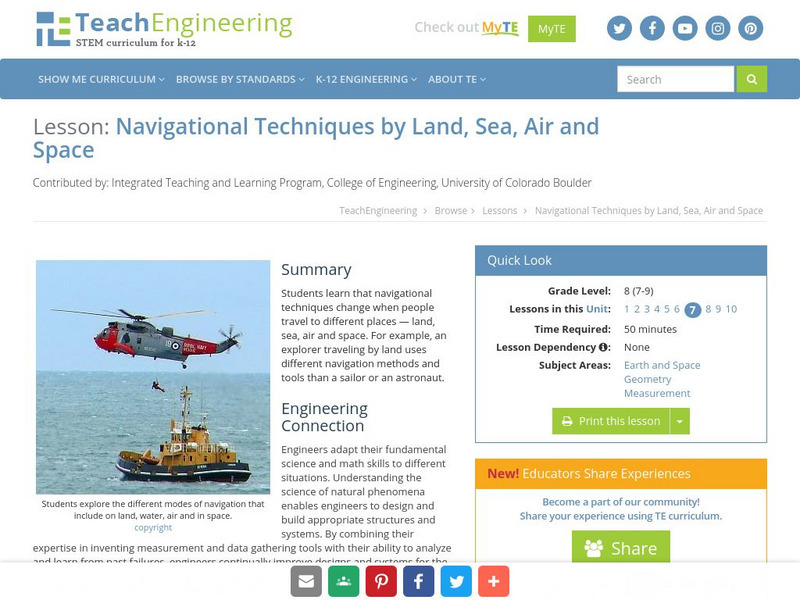 In this activity, students learn that navigational techniques change when people travel to different places - land, sea, air and in space. For example, an explorer traveling by land uses different methods of navigation than a sailor or...