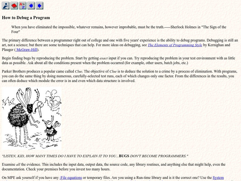 A chapter from an online book on the concepts of C++ program debugging. Includes steps in debugging a system, with illustration, common debugging situations, with illustration, debugging tools, and the debugging environment.
