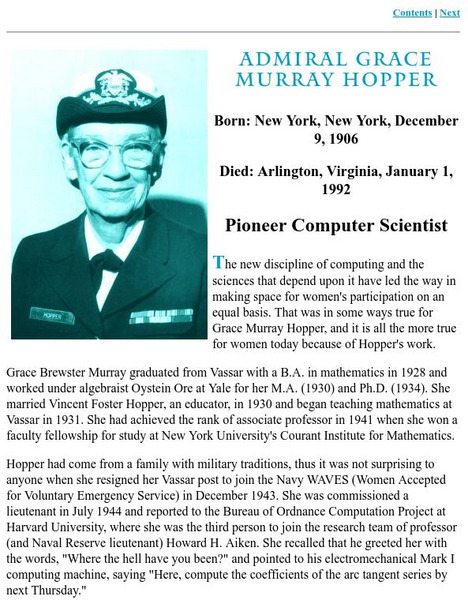 Provides a short biography on Admiral Grace Murray Hopper, pioneer computer scientist.