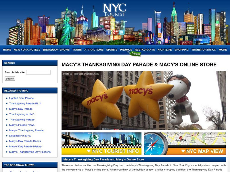 Everything you would want to know if you are planning a trip to the Macy's Thanksgiving Day Parade. There is a photo tour of the parade, a route map, parade history, and hotel and dining information.