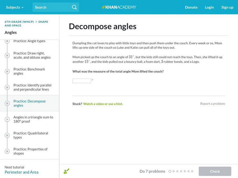 In this exercise, students practice decomposing angles. Students receive immediate feedback and have the opportunity to get hints and try questions repeatedly.