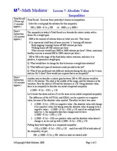 Students solve inequalities. In this absolute value lesson, students solve inequalities containing absolute value. They graph the solution of each problem.