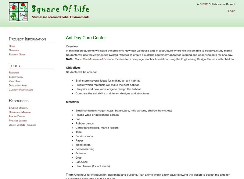 For this lesson, students use the engineering design process to create a home for ants where they can be observed for one day.
