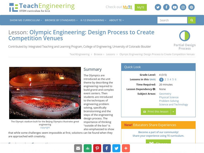 The lesson begins by introducing Olympics as the unit theme. The purpose of this lesson is to introduce students to the techniques of engineering problem solving. Specific techniques covered in the lesson include brainstorming and the...