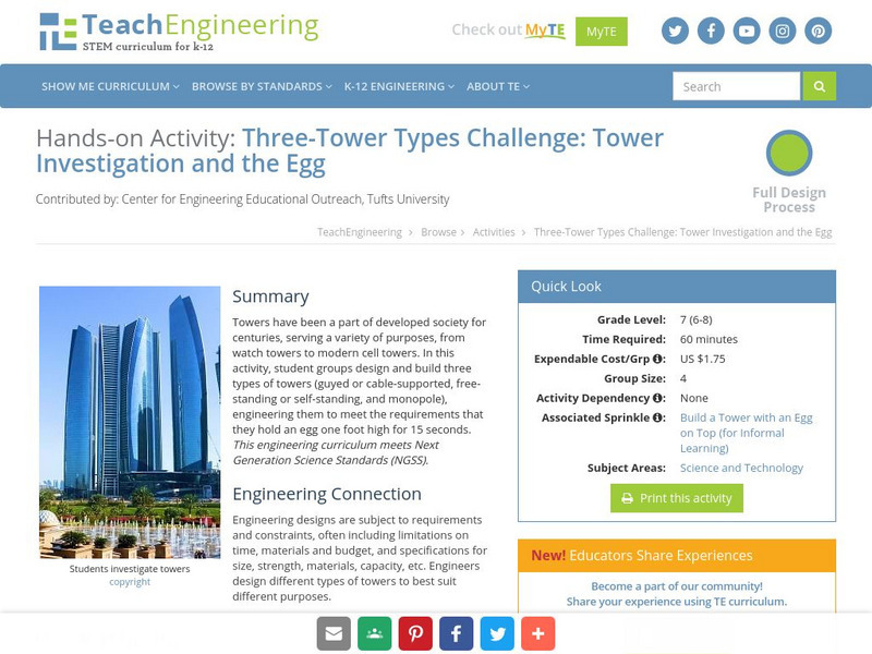 Towers have been a part of developed society for centuries. Towers serve a variety of purposes, from lookouts to cellular towers. In this activity student groups will build three types of towers, engineering them to hold an egg one foot...