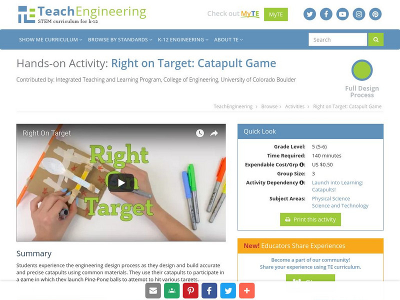 Students experience the engineering design process as they design and build accurate and precise catapults using common materials. They use their catapults to participate in a game in which they launch Ping-Pong balls to attempt to hit...