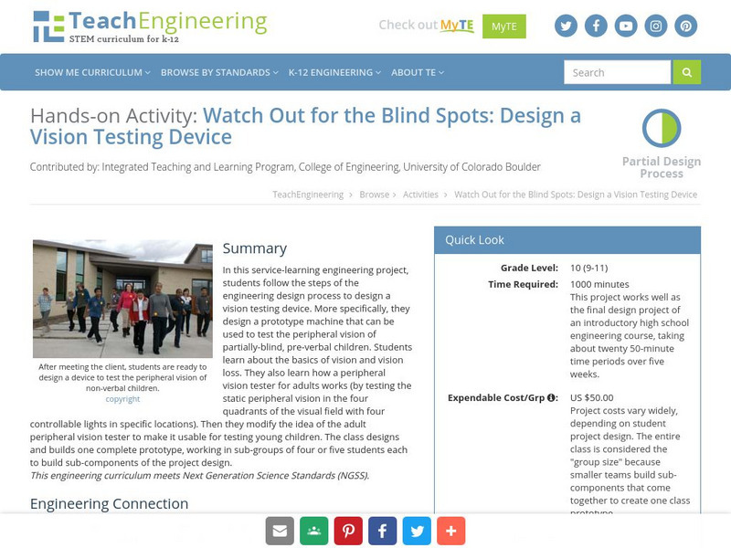 In this service-learning engineering project, students follow the steps of the engineering design process to design a hearing testing device. More specifically, they design a prototype machine that can be used to test the peripheral...