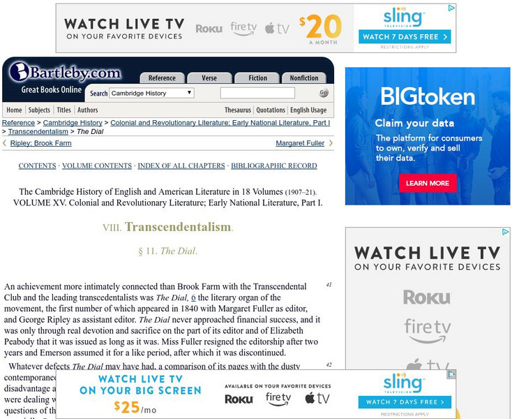 Cambridge History of English and American Literature entry for the Transcendental Club's publication, "The Dial." Provides a history of the publication and its contributing writers.