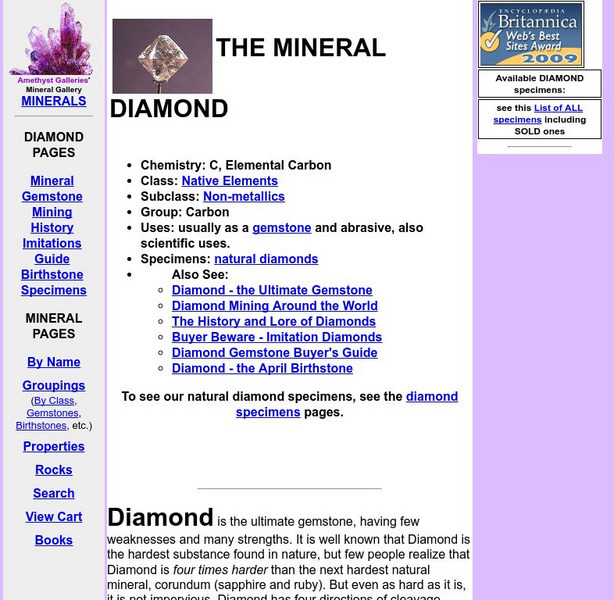 A commercial site that discusses in detail the grading of diamonds, as well as briefly discussing their structure, physical properties, and historical background.