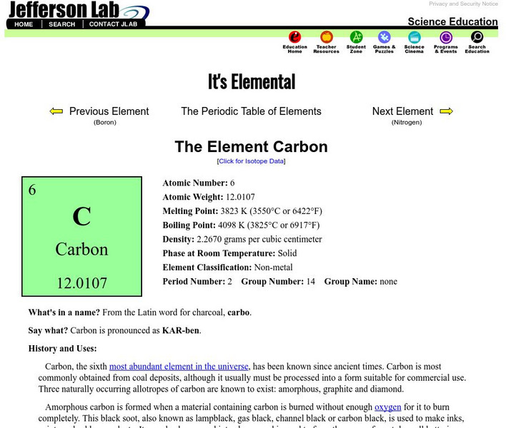 This site from the Jefferson Lab on the element Carbon contains information on the three allotropes of carbon (amorphous, graphite and diamond)and their uses.
