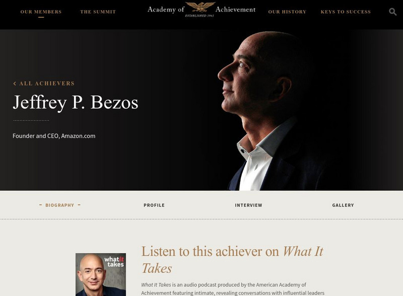 A biography of Jeff Bezos, founder and CEO of e-commerce giant Amazon.com. Includes a profile, videos, and a photo gallery.