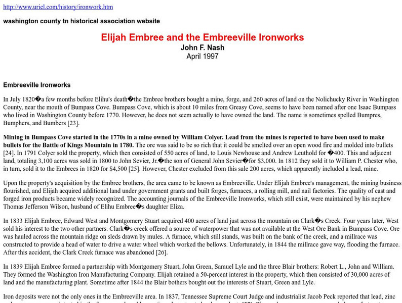 This site gives a biography of Elijah Embree, one of East Tennessee?s leading industrialists of the early 19th century and in the iron industry around the world.