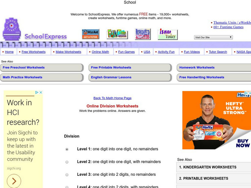 Great place to sharpen your division skills. Start with basic division facts and go all the way up to dividing 2 digit into 3 digit with remainders. You select the level of difficulty and the number of problems. You can also check your...