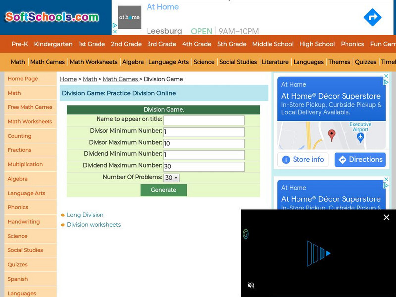 Students can practice division through this online game. They enter the answer to the division problem their score appears at the top of the page.