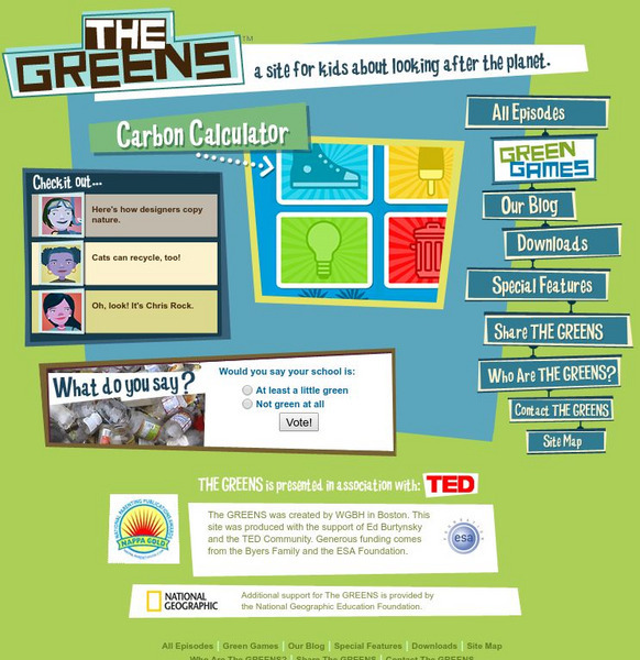 Especially designed website companion to the PBS ecology series The Greens helps kids explore ideas about making smart environmental choices. Find animated videos, activity suggestions, projects to do, and solid advice for putting your...
