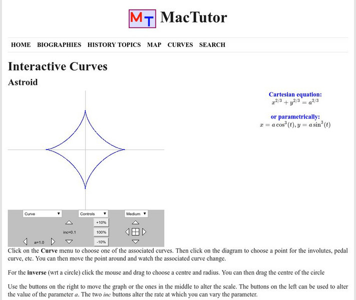 This site, which is provided for by the University of St. Andrews, allows you to zoom in/out and add evolutes, involutes, etc.