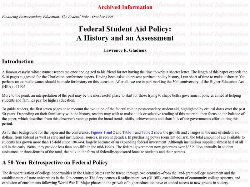 This site offers a scholarly, historical review of federal student aid, along with a discussion of the complex issues of the "achievements and shortfalls" of these aid policies.