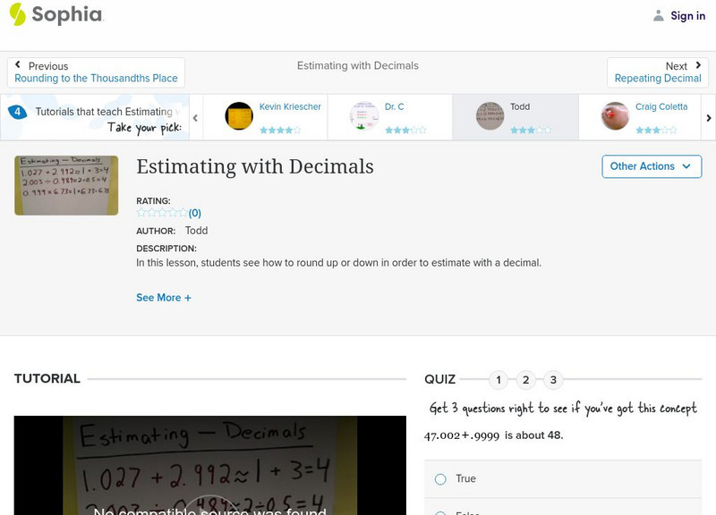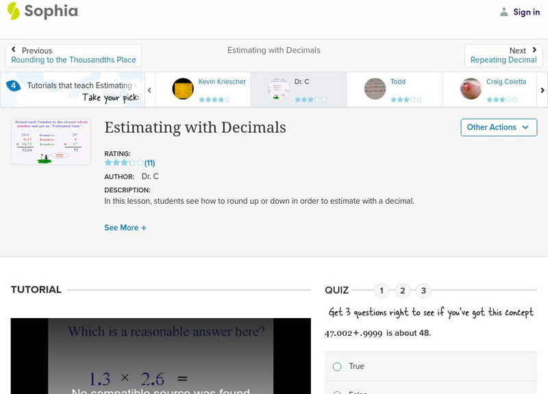 In this lesson, students see how to round up or down in order to estimate with a decimal. It is 5 of 10 in the series titled "Estimating with Decimals."