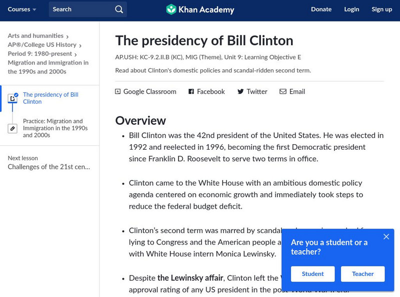 Page discusses the culture, economy and political atmosphere of the Bill Clinton era. Site includes questions for review and critical thinking, glossary and link to primary resources.