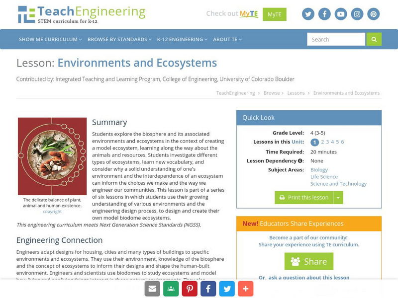 Learners explore the biosphere and its associated environments and ecosystems in the context of creating a model ecosystem, learning along the way about the animals and resources. Students investigate different types of ecosystems, learn...