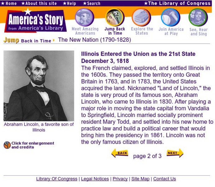 The historical account of how Illinois became a state, some of its prominent citizens, and great photographs can be found at this site.