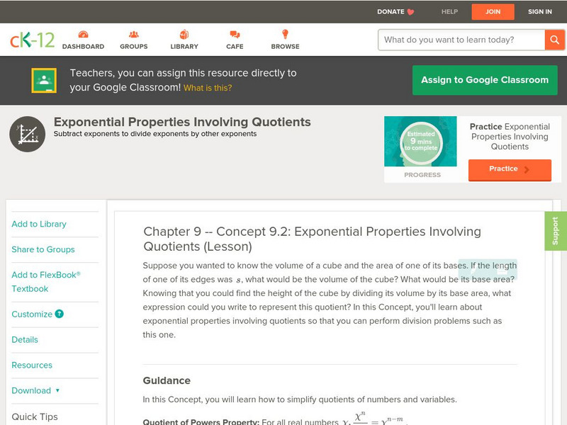 [Free Registration/Login may be required to access all resource tools.] Learn how to apply basic properties of exponents in quotients.