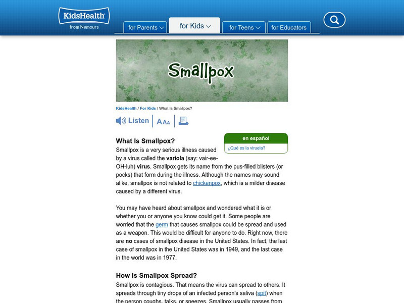 From Kids Health, this site describes what smallpox is and answers some other questions kids might have.