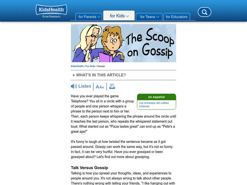 A colorful, interactive site for kids and teens. A holistic approach to learning about your body, including topics such as feelings, drugs, injuries, and other health issues. Available in Spanish.