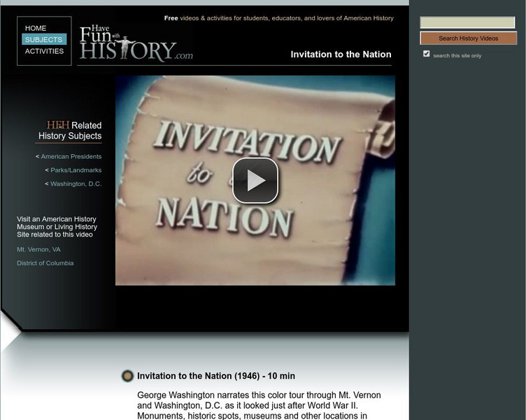 George Washington narrates this color tour through Mt. Vernon and Washington, D.C. as it looked just after World War II. Monuments, historic spots, museums and other locations in the D.C. area are highlighted.