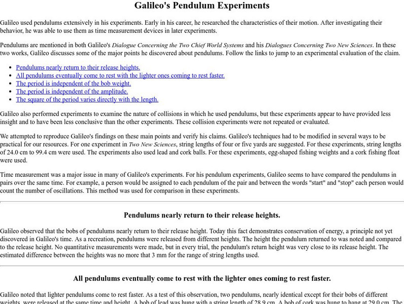 This site from The Galileo Project of the Rice University provides a great look into the pendulum experimens of Galileo. Contains first-hand writings and examples of experiments along with links to additional information.