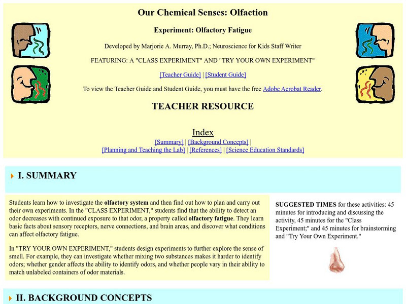 This website provides information on our chemical senses. "Students learn how to investigate the olfactory system and then find out how to plan and carry out their own experiments."