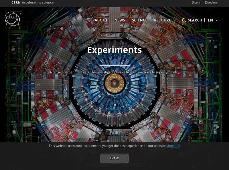 Read about the six experiments at the Large Hadron Collider: ALICE (A Large Ion Collider Experiment), ATLAS (A Toroidal LHC ApparatuS), CMS (Compact Muon Solenoid), LHCb (Large Hadron Collider beauty), TOTEM (TOTal Elastic and...