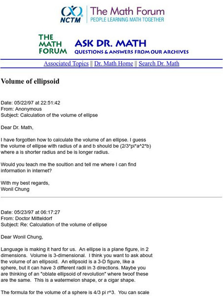 The Math Forum: Ask Dr. Math: Volume of an Ellipsoid