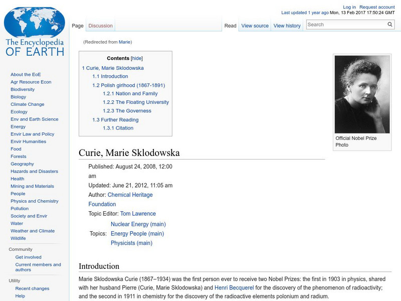 Encyclopedia of Earth: Curie, Marie Sklodowska