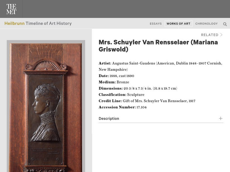 From the Metropolitan Museum of Art this Victorian era neo-classically inclined bronze relief sculpture "Schuyler Van Rensselaer (Mariana Griswold)" by the American artist Augustus Saint-Gaudens. The sculpture is presented as an...