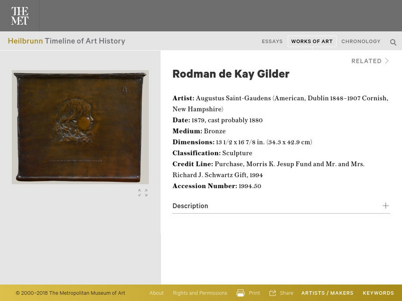 From the Metropolitan Museum of Art this Victorian era neo-classically inclined relief sculpture "Rodman de Kay Gilder" by the American artist Augustus Saint-Gaudens. The sculpture is presented as an enlargeable image with a description...