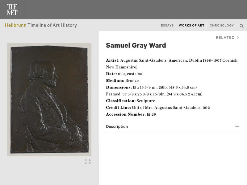 From the Metropolitan Museum of Art this Victorian era neo-classically inclined bronze relief sculpture "Samuel Gray Ward" by the American artist Augustus Saint-Gaudens. The sculpture is presented as an enlargeable image with a...
