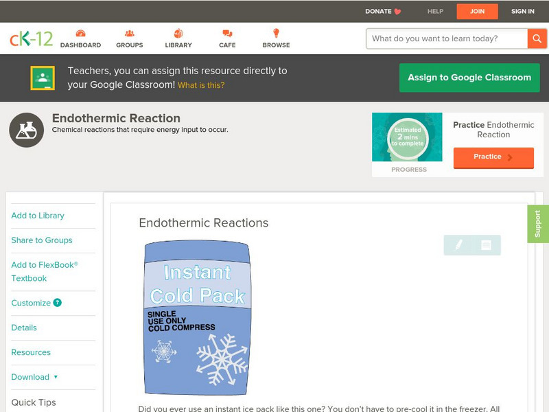 [Free Registration/Login may be required to access all resource tools.] Definition of an endothermic reaction, the role of energy, and examples of endothermic reactions.