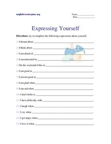 In this self expression worksheet, students read the personal expression statements and complete each one with expressions about themselves. Students complete 15 sentences.
