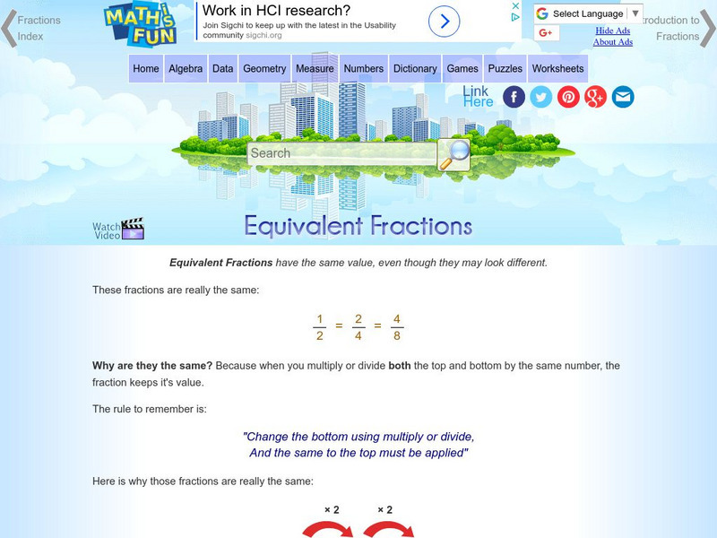 This website offers an excellent lesson plan that teaches basic fraction concepts and includes an equivalent fraction procedure. Lots of detailed instructions on how to prepare and teach this topic.