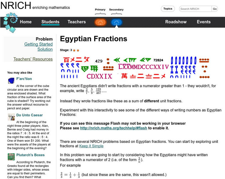 On this one page website find the solution to this Egyptian fractions challenge by using equivalent fractions and your problem solving skills.