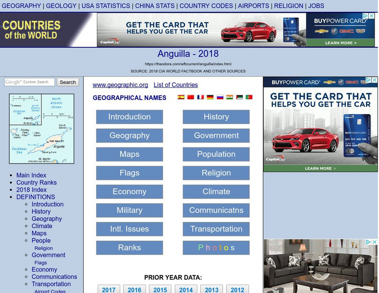 Visit this site to learn all about the history, capital, flag, climate, terrain, people, economy, and population of Anguilla.