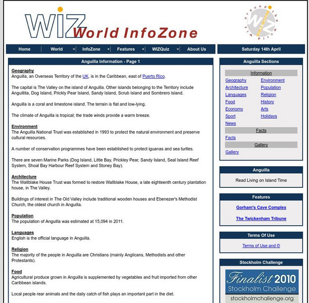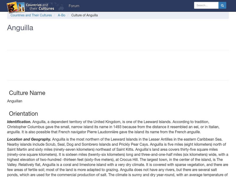 Great resource that is full of useful information about the Territory of Anguilla in the Caribbean. Content includes geography, environment, architecture, religion, food, history, economy, arts, sports, and news. Be sure to look at the...