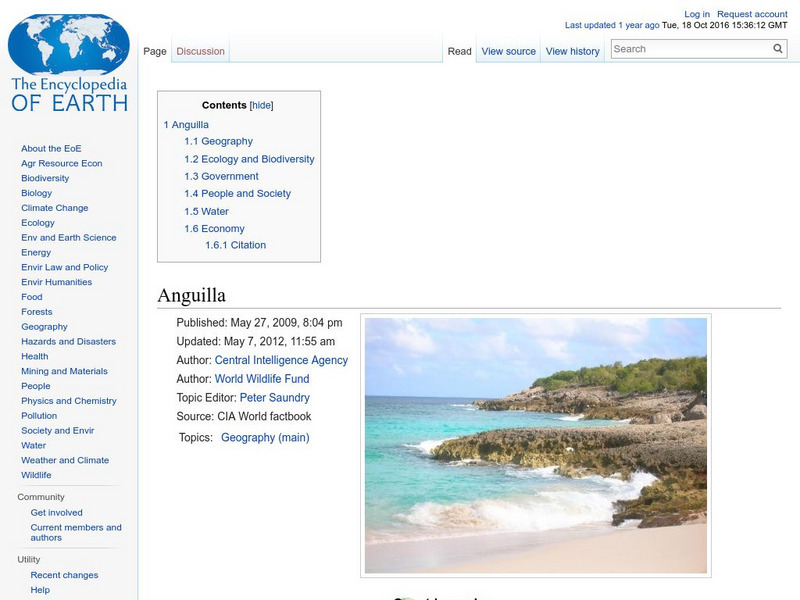 The Encyclopedia of Earth provides an overview of Anguilla (United Kingdom), including its geography, natural resources, history, government, economy, and much more. Maps and images are also included, along with sources used to create...