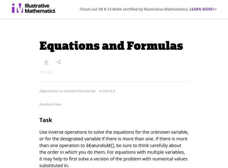 Illustrative Mathematics: A ced.a.4: Equations and Formulas
