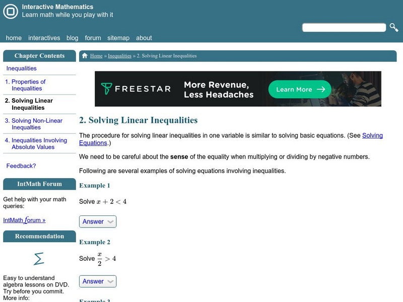 An interactive inequality solver allows you to practice solving problems that are randomly generated. You can practice on your own, then check your steps and the solution.