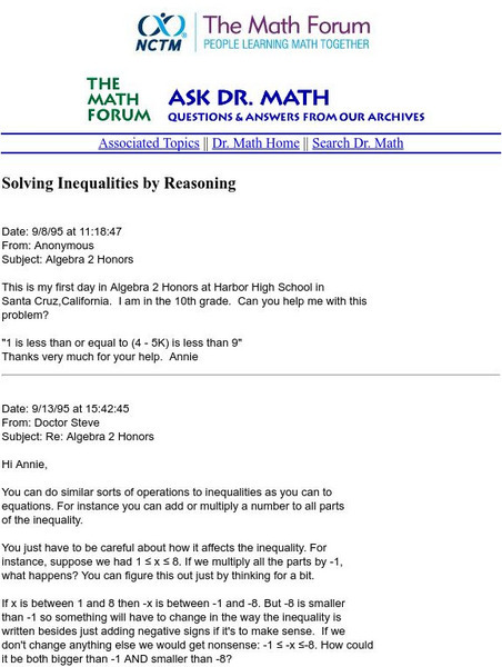 The Math Forum: Nctm: Ask Dr. Math: Solving Inequalities