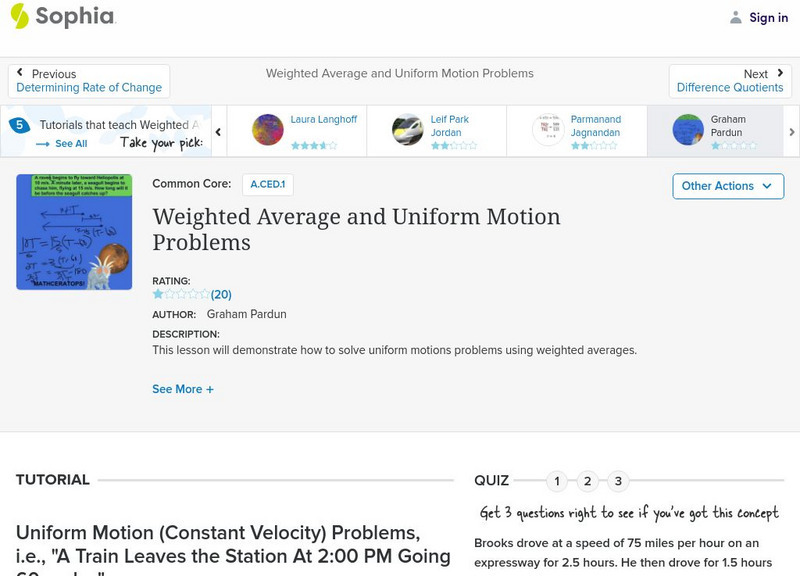 This lesson will demonstrate how to solve uniform motions problems using weighted averages. Student can watch a video tutorial and then take an online quiz.