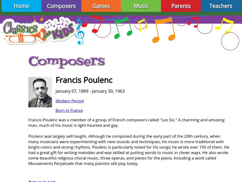 Classics For Kids provides a short biography of Modern composer Francis Poulenc, born on January 7, 1889.