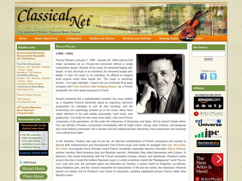 A look at the life of French composer, Francis Poulenc and the influences on his music. Contains a list of his compositions.